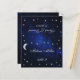 A celestial wedding place card with the guest name and the table number printed on its front and the bride and groom names and the wedding date printed on the other side (that is the other half, before folding it). All text is light grey, almost white calligraphic script. The background is the night sky with the moon and stars around the text. The moon and stars are silvery grey (faux silver foil).