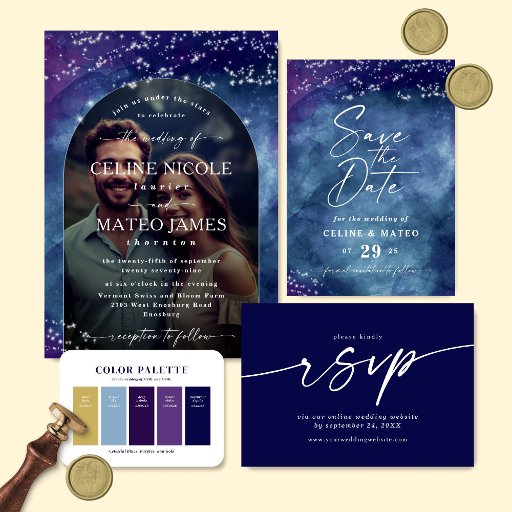 Introducing the "Celine" wedding invitation, featuring a striking celestial design with a modern arch. The deep blue and purple watercolor background mimics the beauty of a starry night sky, while the arched layout adds a contemporary twist. Stars are sprinkled across the card, creating a cosmic, magical vibe perfect for evening or outdoor weddings. This invitation blends timeless elegance with a dreamy, ethereal aesthetic, making it ideal for couples seeking a celestial or cosmic theme. The back features and elegant custom bride and groom framed monogram. Personalise it with your wedding details to create an invitation that's truly unique and beautiful!