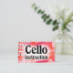 Colourful arty Cello instruction business cards in hot pink, orange, black and white.