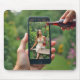 A hand pours red wine from a bottle into a glass perfectly aligned with the cellphone's screen while a woman sitting in a garden is watching creating an intriguing visual blend of digital and reality.