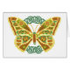 A monarch butterfly decorated with Celtic knotwork and spirals in shades of gold, orange, and green!
