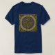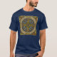 An elaborate compass made of Celtic knotwork, printed in silver and copper metallic colour accents on the face and corners as well. Degrees are marked off from 10-90 in each quadrant. Around the compass, all four cardinal points are labelled in engraved-looking Irish-Gaelic on brass colour plates, subpoints are labelled in Irish-Gaelic, and twelve elemental points as well: earth, storm, lightning, metal, air, sun, wind, wood, water, fire, spirit, stone. Also, subtle, decorative rune work decorates an inner ring.