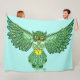 Green Celtic knot work owl with open wing span in a backdrop of teal.