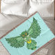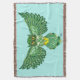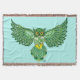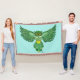 Green Celtic knot work owl with open wing span in a backdrop of teal