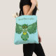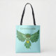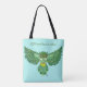 A Celtic knot work owl with an open wing span in a backdrop of teal.