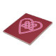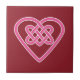 A simple pink Celtic knot heart ceramic tile, against a red background.