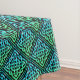 A tablecloth with a blue-green Celtic knot repeated diamond tile design against a black background.