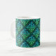 A mug with a repeated tiled design of a diamond blue-green Celtic knot against a black background.