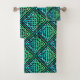 A towel set - wash cloth, hand towel, and a bath towel - with a blue-green Celtic knot repeated tile design against a black background. You can choose to just buy one of the set too!