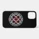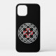 A black iPhone 12 Mini Case with a Celtic knot design with a red square cross in the centre.