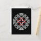 A postcard with a Celtic knot design with a red square cross in the centre.