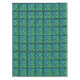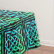 A tablecloth with a blue-green Celtic knot design against a black background.