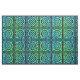 A piece of fabric with a blue-green Celtic knot repeated square tile design against a black background.
