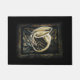 An aerial view of a small cream coloured dragon resting atop intricate Celtic knot work carved in tones of brown, black, and grey stone. Set against a deep black backdrop.