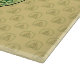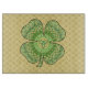 This classic four leaf clover overlays a concentric circle design featuring layers of Celtic weaves in multiple shades of green with a bit of orange for accent.