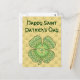 This classic four leaf clover overlays a concentric circle design featuring layers of Celtic weaves in multiple shades of green with a bit of orange for accent.