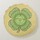 This classic four leaf clover overlays a concentric circle design featuring layers of Celtic weaves in multiple shades of green with a bit of orange for accent.