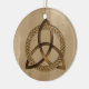 A round ornament featuring a simple coloured Celtic triquetra interlaced with a circle forming a trinitarian symbol against a wood background, representing spiritual unity with the divine.