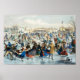 "Central Park, Winter - The Skating Pond" beautifully captures the lively and festive atmosphere of winter in Central Park. The painting depicts a bustling ice skating rink, filled with people demonstrating various skating poses, while couples or lovers hold hands as they glide across the ice. Playful dogs add to the joy of the scene. In the distance, a grand bridge arches over the landscape, with snow-covered trees and charming old buildings enhancing the nostalgic winter scene. The entire composition evokes a sense of warmth, cheer, and timeless beauty, encapsulating the spirit of a classic winter day.