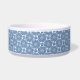 Ceramic pet bowl is shown with a lovely blue and white tile style print.