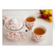 Ceramic tea set with floral pattern, and freesia flowers out of focus in the background.