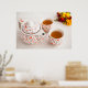 Ceramic tea set with floral pattern, and freesia flowers out of focus in the background.