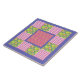 A pretty Ceramic Tile, decorated with a faux-patchwork pattern of deep pink, violet blue and yellow primroses on a leafy green background, with deep pink and white check gingham and polka dots; from the Posh & Painterly "Primroses" collection.