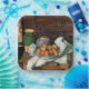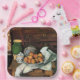 Paul Cezanne painting: Vessels, Fruit and Cloth in front of Chest, square tile.