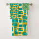 This towel set has a mid-century modern design of rounded rectangles with ovals inside in retro colours of turquoise, teal, off-white, and gold. If you want the same design with different colours, message me.