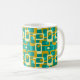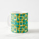 This mug has a mid-century modern design of rounded rectangles with ovals inside in retro colours of turquoise, teal, off-white, and gold. If you want the same design with different colours, message me.