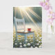 Sunlight beams through a cluster of trees illuminating a serene field of white flowers where a solitary white chair with a red mug on its seat for a birthday.