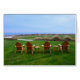 Adirondack chairs are lined up to watch golfers come onto the green of the eighteenth hole of a golf course on Kiawah Island, South Carolina that borders the Atlantic ocean. Beyond are the dunes, the beach and the Atlantic Ocean. On the back is a golf cart.