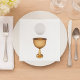 This design is a chalice. The chalice is gold and has a piece of bread above it. This chalice design looks great on this Paper Napkins