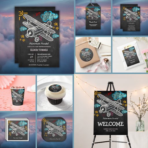 Celebrate the arrival of your little explorer with our Chalkboard Adventure Awaits Aeroplane Baby Shower Collection! Featuring a vintage aviation theme with hand-drawn aeroplanes, fluffy clouds, and a rustic chalkboard background, this collection brings a charming, travel-inspired touch to your special day. If you need any other matching product or customisation, kindly message via Zazzle.