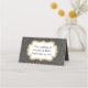 Chalkboard grey folded place card with a gold tone polka dot background. Graphics of a gold edged text plaque, on the front is ready to personalise by hand for each guest at your wedding. The back of the card has the same gold edged plaque with custom black text ready for you to change to read what you want.