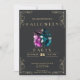 At the heart of this design is a beautiful witch, wearing a striking blue and black witch's hat. Her flowing hair, in shades of blue and pink, brings a captivating mix of colour that contrasts perfectly with the dark, moody theme. This witch's modern yet mystical vibe adds a unique flair to the classic Halloween aesthetic, making the invitation both whimsical and magical.