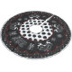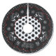 Stylish chalkboard Christmas Tree skirt with reindeer and snowflakes. Scalloped trim design on inner edge and polka dot border in black, grey and white.