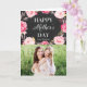 Celebrate your mum's special day by giving her a beautiful mother's day card! The elegant mother's day greeting card features a chalkboard background, pink floral wreath, Happy Mother's Day in a chic script font, and placeholders for a photo and custom text.
