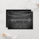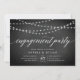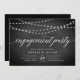 Our rustic elegant engagement party invitations in black and white feature a chalkboard background with strings of white lights across the top, and "engagement party" in chic calligraphy script typography. Personalise with your engagement celebration details beneath in white.