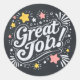 Celebrate achievements with this fun and motivational 'Great Job!' sticker. Featuring a charming chalkboard-style design with bright stars, swirls, and confetti, this sticker is perfect for teachers, coaches, parents, or employers to give out as a reward. The playful elements and bold typography make it a cheerful way to recognise hard work and accomplishments. Great for adding a special touch to notebooks, water bottles, or gift bags