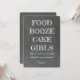 "FOOD BOOZE CAKE GIRLS NOW THAT I HAVE YOUR ATTENTION will you be my Groomsman?" Funny proposal cards in a modern chalkboard typography style.
