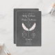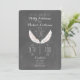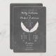 A wedding invitation featuring an illustration of two white feathers accented with peach and blue over a chalkboard inspired background.