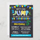 Jump birthday bash invitation, blue, green and yellow colour scheme suitable for any age. Add your own wording into the template, to more customisation (font colour, font style, background), click on personalise, scroll down and click on link "click to customise further".