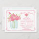 Modern Mason Jar Bridal Shower Invitation featuring a country mason jar filled with pink cottage roses flowers set on a chic white background with a pretty floral & butterfly accent and a whimsical frame. Flip our bridal shower invite over to view a matching back for an extra special touch. Perfect for a rustic country chic bridal shower for fall, winter, spring or fall.