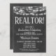 A fun black and white chalkboard real estate school graduation party invitation with glowing lights at the top.