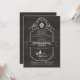 A trendy design in chalkboard black and white with a hint of vintage flair. Featuring a lovely swirl-top with a chef's hat and a decorative panel and banner. It's finished with a bottle and glass of wine next to a covered chafing dish.