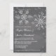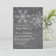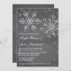 A beautiful chalkboard snowflake wedding invitation with two pretty snowflakes with a leaf and floral design and pretty shades of grey heart shaped snow and ice reflections behind it. Perfect for a winter wonderland or Christmas themed wedding. Artwork © Chrissy H. Studios, LLC. All rights reserved.