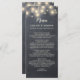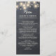 Chalkboard string light wedding menu features pink peonies in a mason jar.