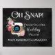 Chalkboard effect background with watercolor colour camera. Sign reads: Oh Snap! Please tag our wedding photos. Add your hashtag.