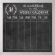 Note: this is not an actual chalkboard. It is a poster made to look like one one. Personalise this custom weekly calendar print with your family monogram text, year established, and title. Frame your poster and use chalk pens to fill in your dates and activity information. Write directly on the clear glass or acrylic frame cover and wipe clean easily (with no chalky residue!) using a wet towel.